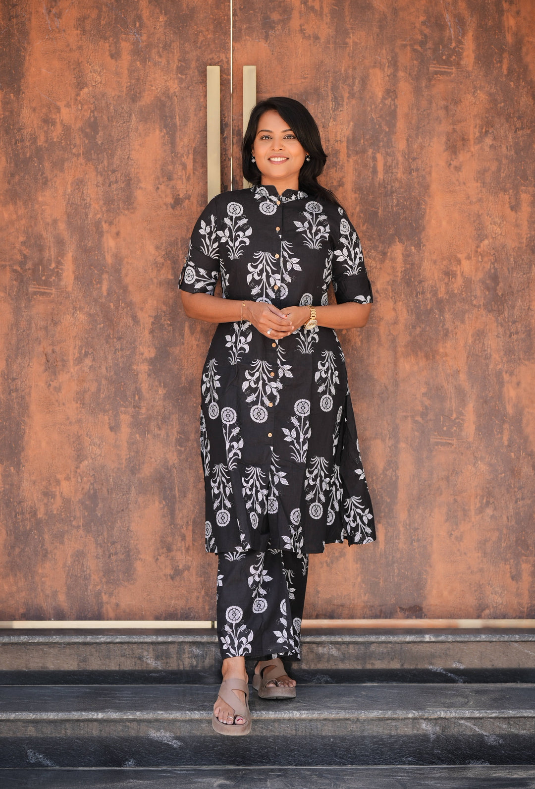 Black flower cotton kurta set (button opening)