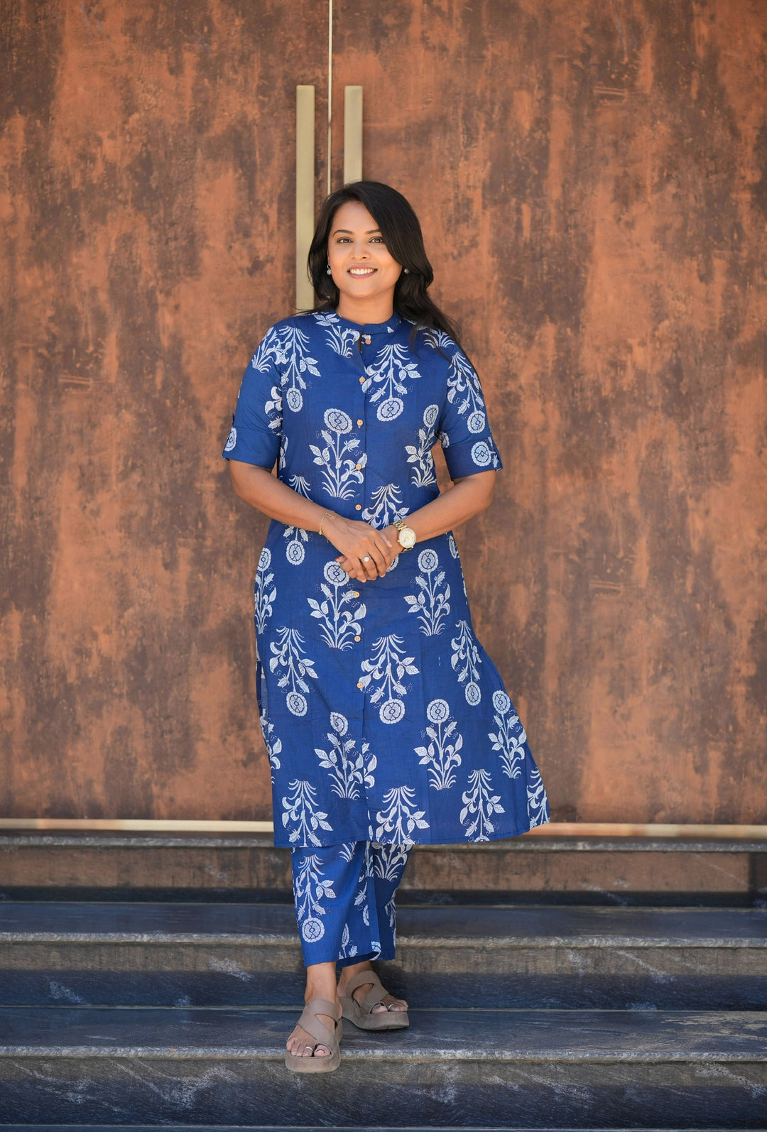 Blue flower cotton kurta set (button opening)