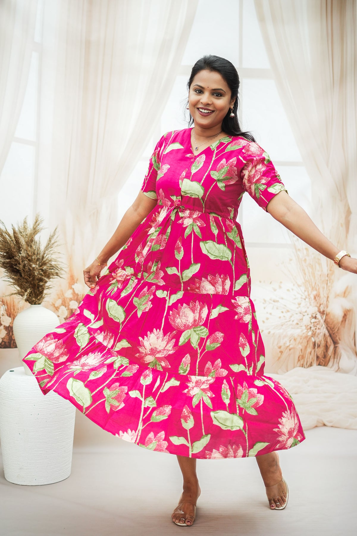 These pretty cotton dresses are perfect for the summer, offering both style and comfort. Crafted from lightweight, breathable cotton fabric, they ensure you stay cool and comfortable even on the hottest days. The standout feature is the convenient center zipper, which adds versatility, making these dresses suitable for both non-maternity and maternity wear.