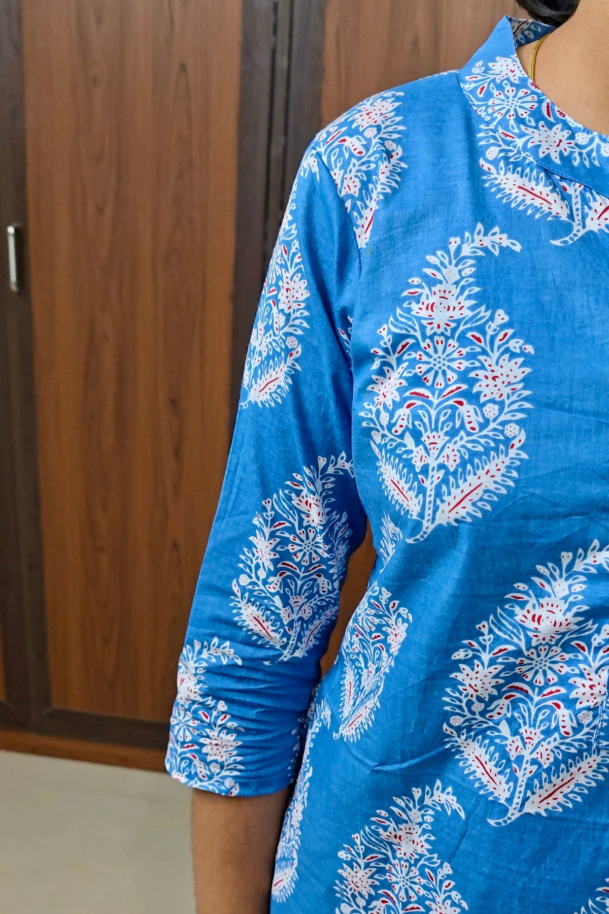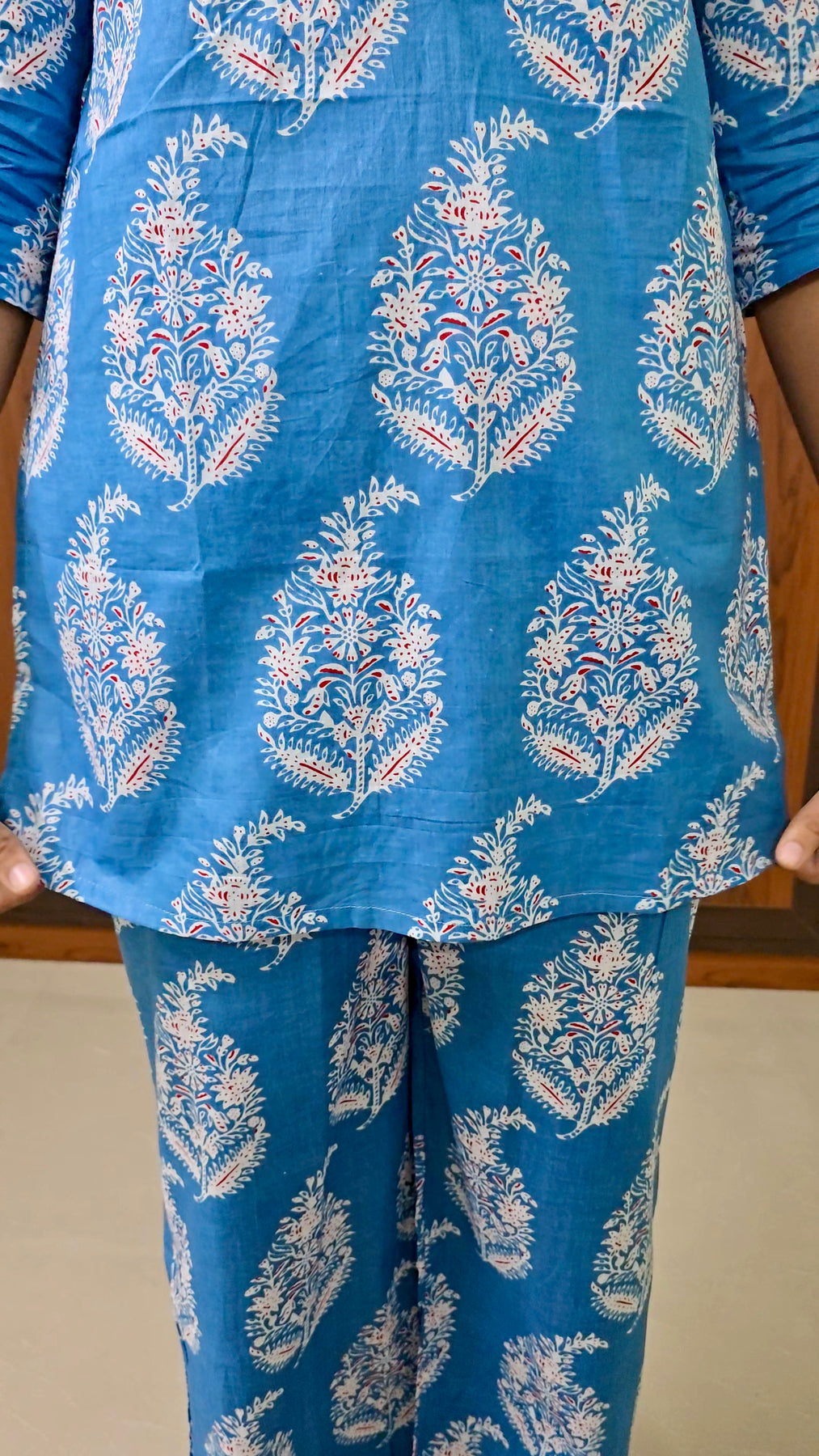 Kurta & bottom for women who love modest yet functional loungewear. The set comes with a high-neck, top featuring 3/4th sleeves and a pair of relaxed-fit palazzo pants with roomy pockets. Thoughtfully stitched with extra seams, it allows easy size adjustments in the future. Crafted in soft, breathable cotton, Haasya keeps you covered and comfortable all day long.