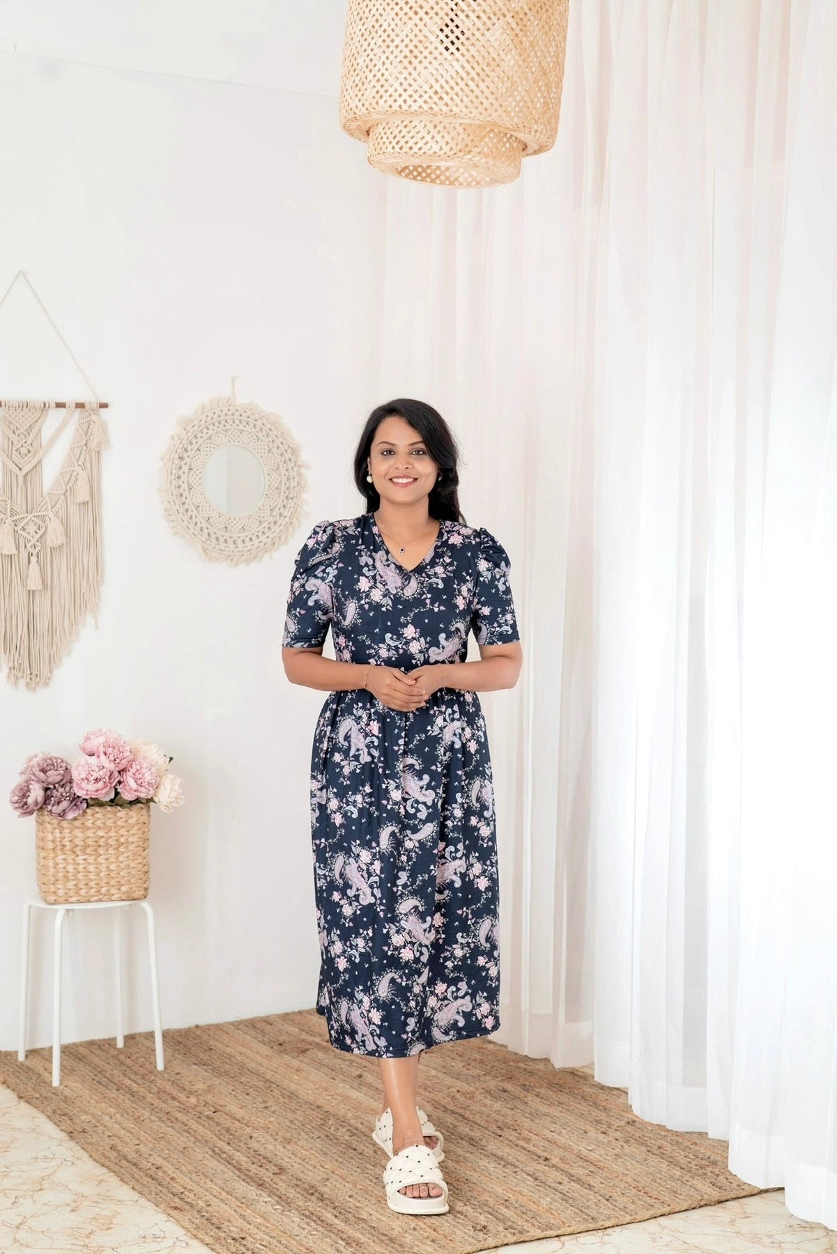 STYLE: Ankle  Length Flap  Maternity Nursing Dress      PRINT: Flower Print